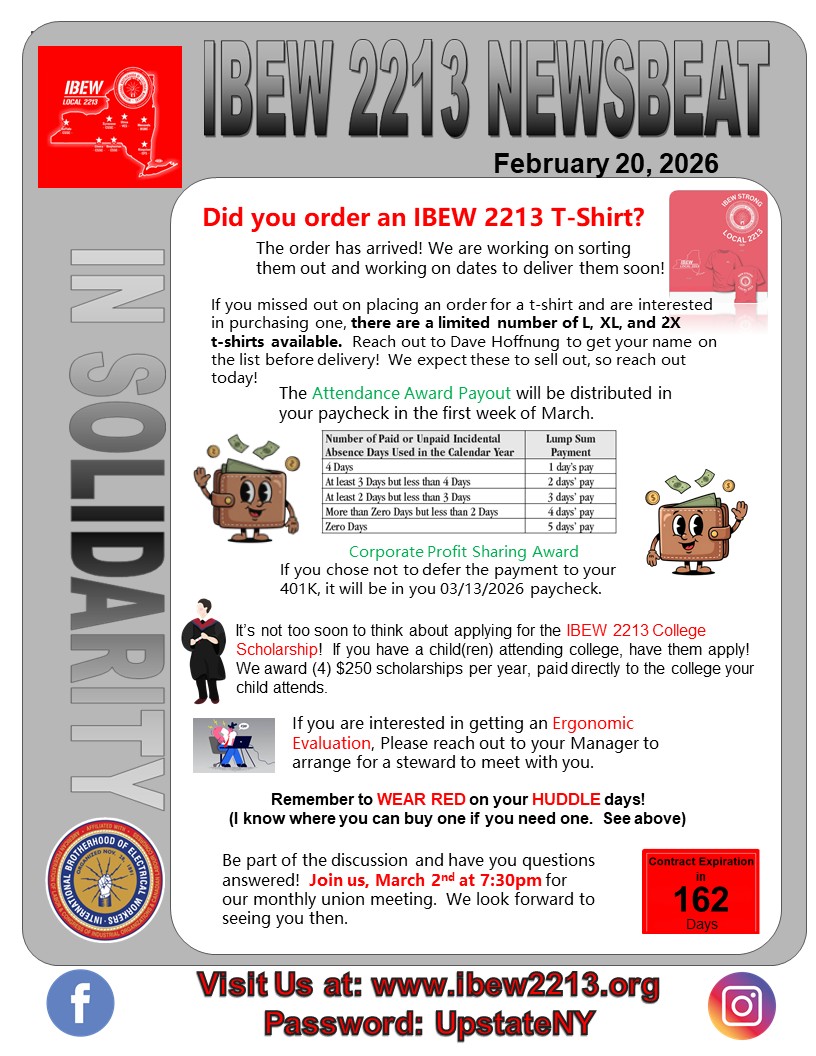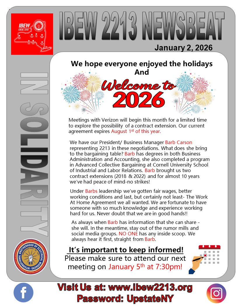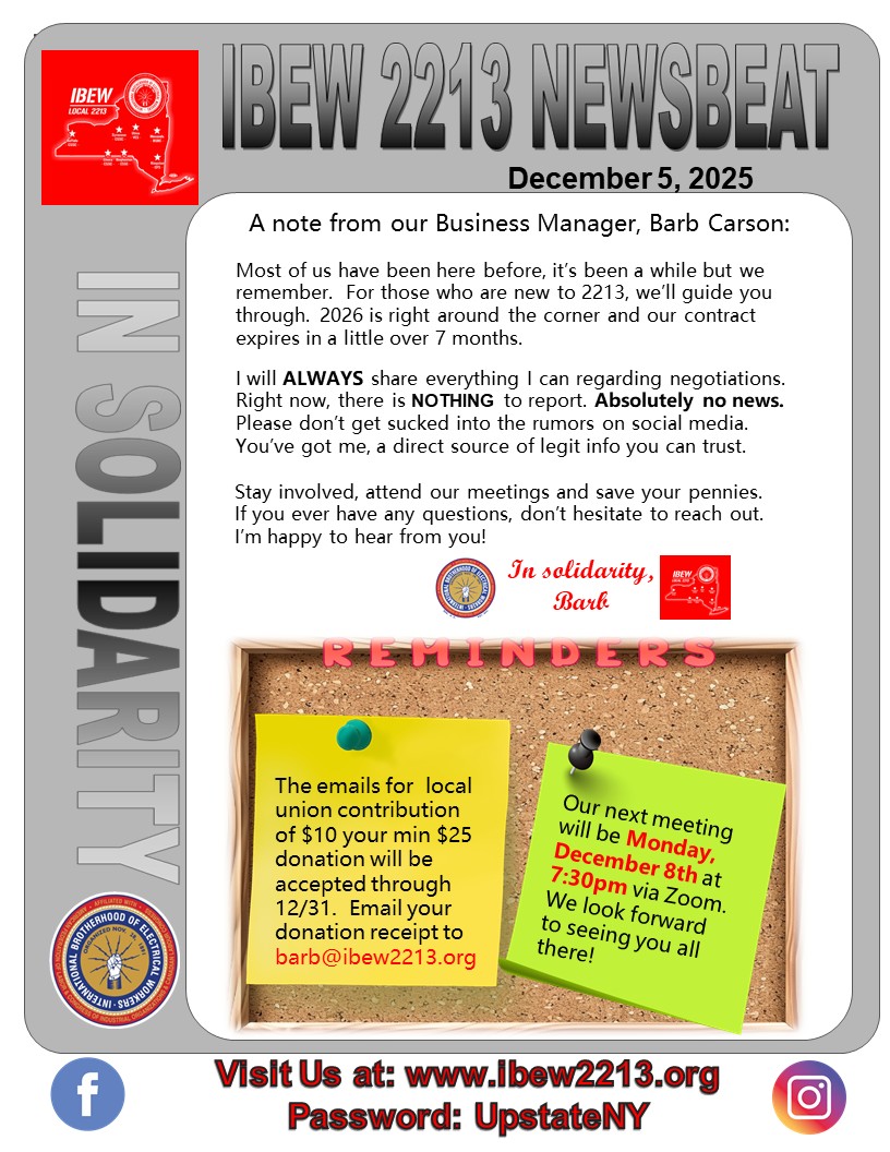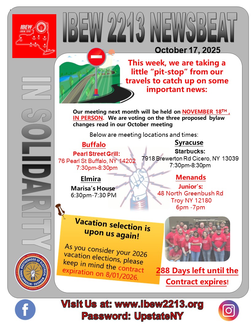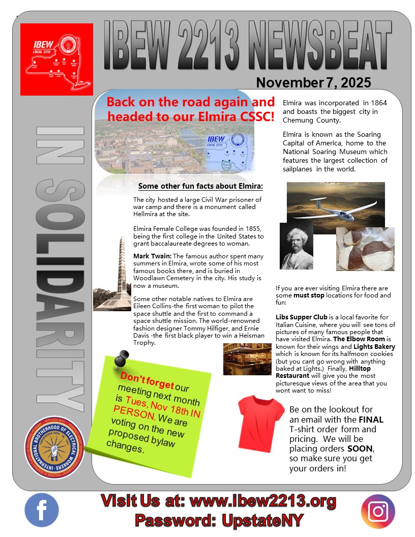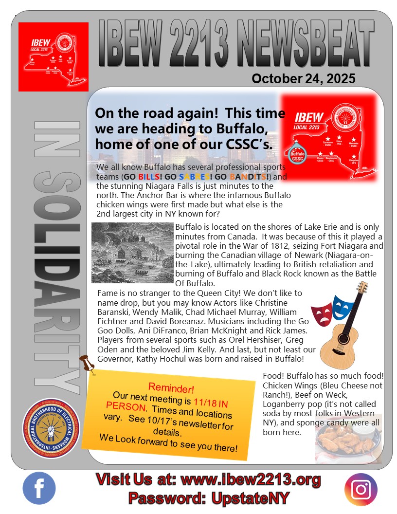 We began as the Telephone Commercial Union Local 2213, formed in July of 1948. After the Alliance of Independent Telephone Unions, in 1949, we began our National bargaining with the Bell System, thus reorganizing in 1975 to become the Telecommunications International Union (TIU). With the divestiture of AT&T, also ended the TIU, driving all of the TIU Affiliates out to seek protection by the AFL-CIO with one of its International Labor Organizations. In 1985, we held an election by secret ballot to affiliate with either CWA or IBEW. The IBEW won and we became IBEW Local 2213 as of December 1, 1985.