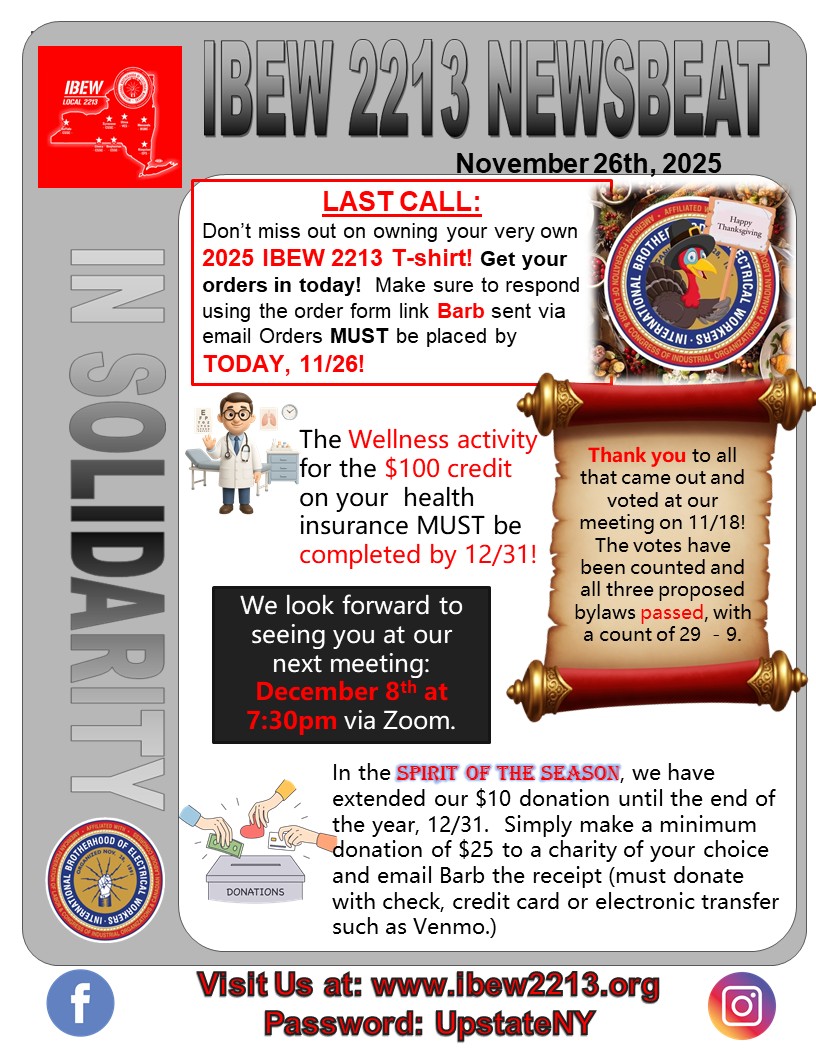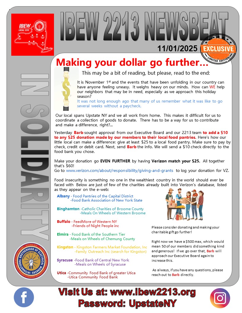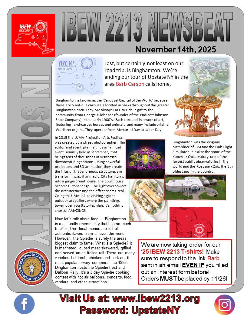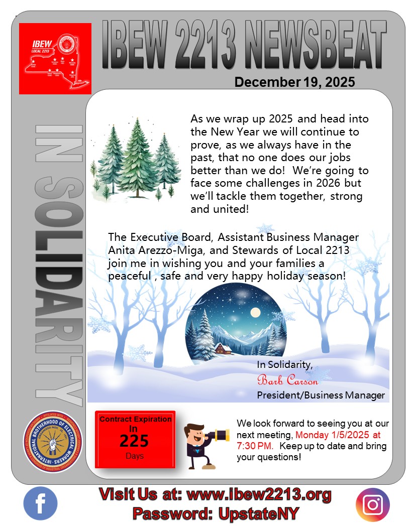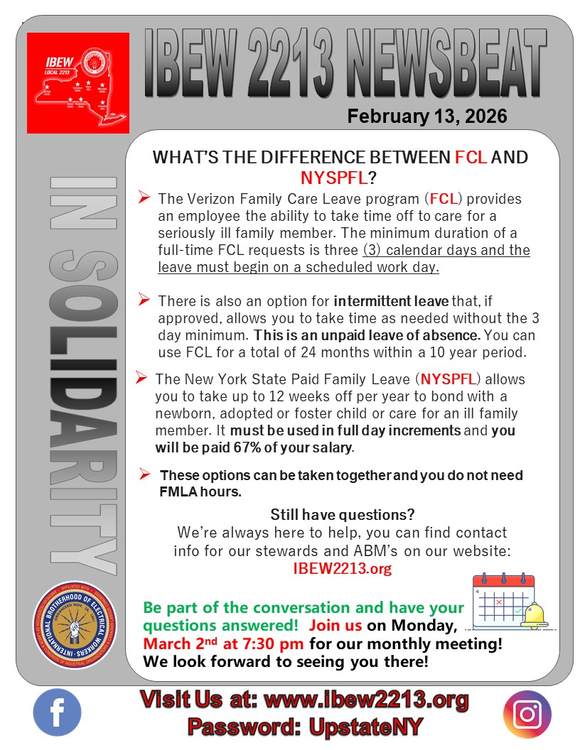 We began as the Telephone Commercial Union Local 2213, formed in July of 1948. After the Alliance of Independent Telephone Unions, in 1949, we began our National bargaining with the Bell System, thus reorganizing in 1975 to become the Telecommunications International Union (TIU). With the divestiture of AT&T, also ended the TIU, driving all of the TIU Affiliates out to seek protection by the AFL-CIO with one of its International Labor Organizations. In 1985, we held an election by secret ballot to affiliate with either CWA or IBEW. The IBEW won and we became IBEW Local 2213 as of December 1, 1985.